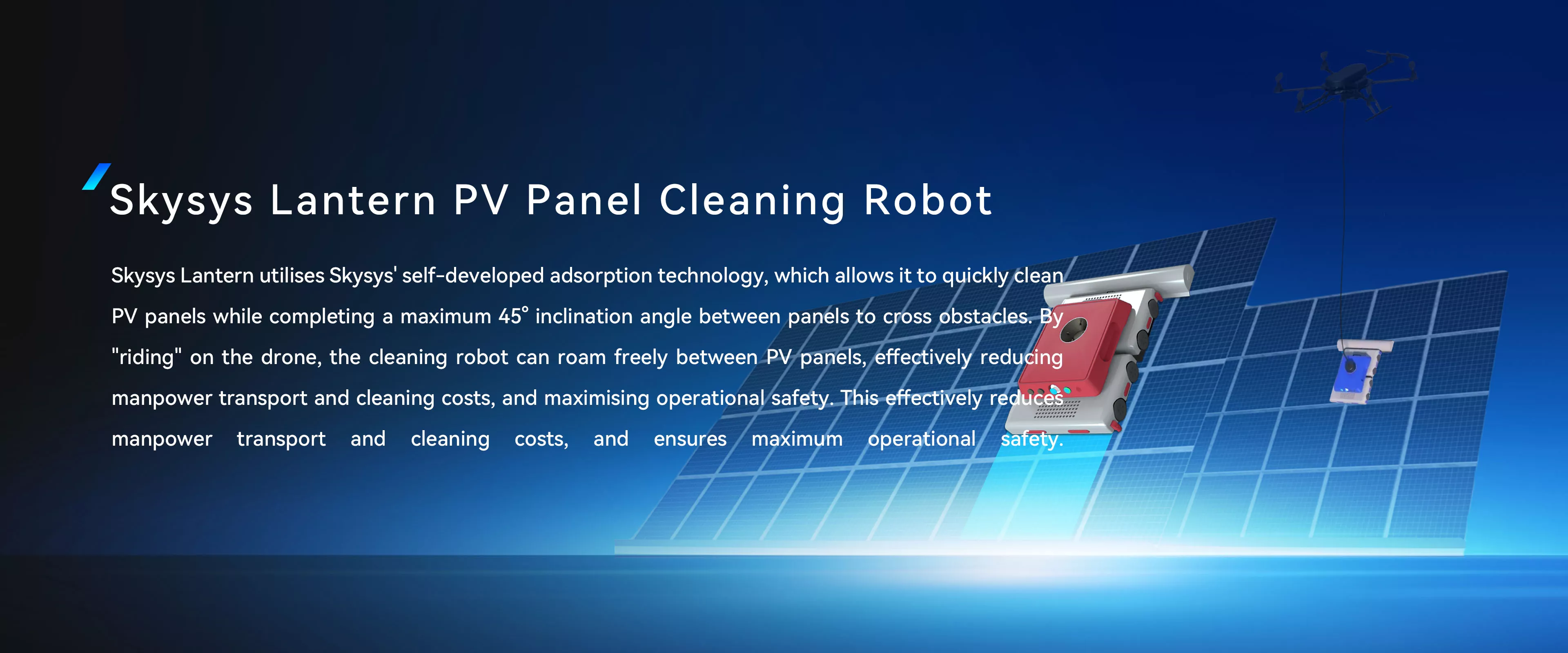 SSkysys Lantern is Skysys' latest PV panel cleaning robot, using Skysys' self-developed adsorption technology, the robot can quickly sweep the PV panels while completing the maximum 45 ° tilt angle between panels to cross the obstacles, and through the "ride" of the drone, the cleaning robot can be in the PV panels between the roaming any way, effectively reducing manpower transport and cleaning costs, and maximise the guarantee of operational safety.